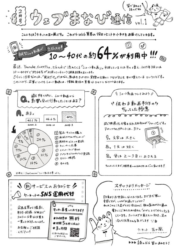 スタッフブログ 2026.02.27 ケーネットの広報誌“第一弾”を発行いたしました。 Web業界に関する役立つヒントや小ネタを、毎月お届けしてまいります。 日々の業務や情報収集に、少しでもお役立ていただけましたら幸いです。 今後ともどうぞよろしくお願いいたします。